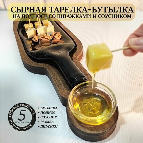 Сырная тарелка-бутылка на подносе с шпажками, соусником и хмельной пьяной рюмкой - это подарок на 23 февраля от мастерской ручной работы Легродеко. Этот набор посуды из бутылки станет изюминкой любого стола и придаст особый шик вашей кухне. Тарелка в этом наборе выполнена из бутылки, что делает ее уникальной. Каждая деталь данных столовых принадлежностей имеет свою форму и текстуру, которые добавляют оригинальности всему набору. Подача блюд на такой тарелке будет выглядеть очень эффектно.
