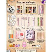 набор тетрадей 5 шт, карандаша цветные 12 шт, текстовыделители 6 шт, набор Magic Box 5 шт, набор закладок, простые карандаши 10 шт, пенал, набор ручек 12 шт, набор линеек 4 шт, корректор, блокнот, ластик, точилка, румбокс