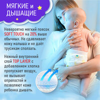 Мягкий защитный пояс Soft Touch нежно облегает ребенка, не сдавливая ноги и не вызывая раздражения чувствительной кожи. Завышенный пояс предотвращает сползание подгузника во время активных игр и бодрствования ребенка.