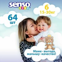 Купить Подгузники детские Senso Baby, дневные (ночные), 15-30 кг, 6 размер, 64 штуки, экономичные, одноразовые дышащие с индикатором влаги для детей, девочек мальчиков на липучках с доставкой по всей России.