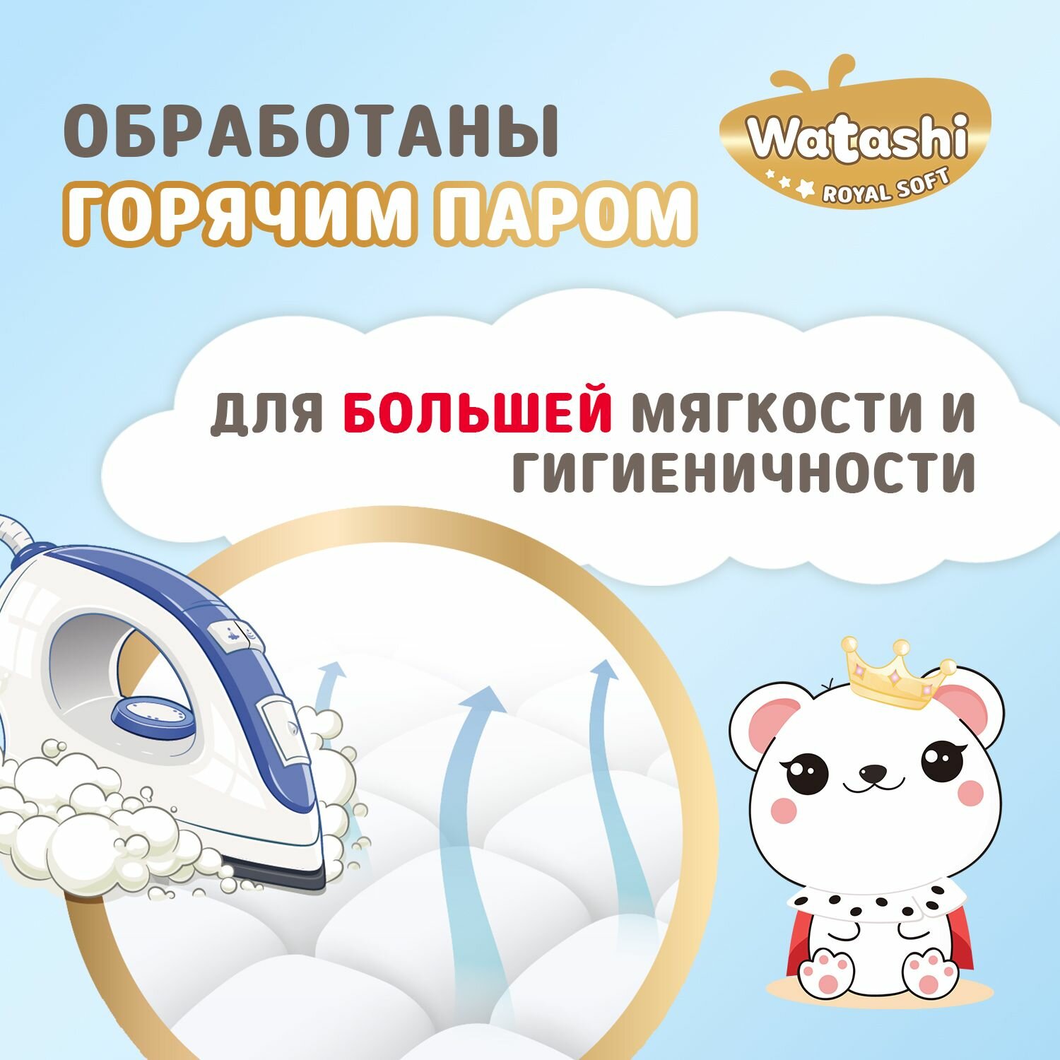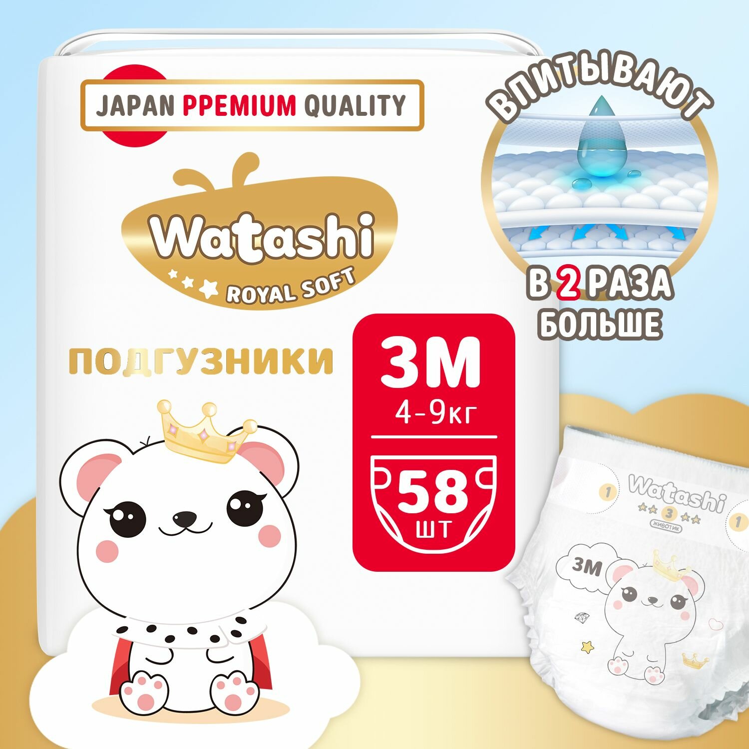 WATASHI Royal Soft Детские одноразовые подгузники 3/M 4-9 кг mega-pack 58шт. Новинка! Бренд Watashi с радостью представляет новую королевскую линейку трусиков и подгузников royal soft. При создании watashi royal soft мы учитывали разнообразные потребности мам и их малышей и объединили все лучшее в продукции бренда: инновационные японские технологии, премиальные материалы, высокие стандарты качества. Внутренняя инновационная система впитывания подгузников watashi royal soft способна мгновенно поглощать в 2 раза больше влаги, потому что в составе впитывающего слоя очень много 100% японского суперабсорбента Sumitomo, который стремительно распределяет влагу по всей поверхности впитывающего слоя и удерживает ее, обеспечивая сухость и днем, и ночью. Вся поверхность подгузников Watashi Royal Soft выполнена из супермягких дышащих материалов hotair, обработанных горячим паром, которые при соприкосновении с кожей малыша обволакивают ее, как нежное пушистое облачко хлопка. Многочисленные микроотверстия во внешнем слое подгузников выводят испарения, поддерживая их сухими и комфортными изнутри, поэтому попка малыша не остается холодной. Анатомическая форма подгузников q-shape с двойными защитными бортиками подстраивается под движения малыша, обеспечивая плотное прилегание и 100% защиту от протеканий. спереди и сзади подгузников есть указатели «животик» и «спинка», которые помогут правильно их надеть на малыша, а указатели 1-2-3 на ленте подгузников помогут равномерно закрепить липучки с обеих сторон. На подгузниках размера nb есть специальный вырез для пупочка для быстрого заживления пупочной ранки. Суперполезный индикатор наполнения подскажет, когда сменить подгузники, так как при намокании окрашивается в голубой цвет. Watashi знает, как важна для мамы каждая минута, проведенная с малышом, поэтому линейка трусиков и подгузников Watashi Royal Soft создана, чтобы дарить маме драгоценное время на приятную заботу, а не на досадные хлопоты!