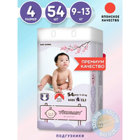 Подгузники Yokobaby baby diaper L размера 4 (9-13 кг) предназначены для детей от 4 месяцев до 2 лет. В упаковке 54 штуки, что обеспечивает длительное использование подгузников.