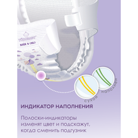 Белая нежная ткань не оставляет следов на белье, а индикатор влажности способствует соблюдению гигиены подсказывая, когда нужно заменить подгузник на новый. Доработанные липучки застежки спасают от протеканий, а мягкая выкройка манжеты заботливо обеспечивают свободу ног, сутки не сковывая действия, чему разы детки даже спустя несколько часов движений.