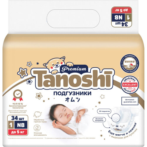 Купить Подгузники Tanoshi Premium, размер NB / 1 (до 5 кг) 34 шт, с вырезом под пупочек с доставкой по всей России.