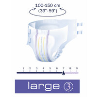 Двойная система крепления с помощью эластичных резинок в поясе сзади и спереди, а также двойных эластичных застежек-липучек обеспечивает надежное и комфортное использование. Имеется возможность многократного приклеивания и отклеивания застежек-липучек без риска разорвать внешний слой подгузников.