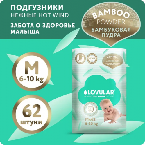Подгузники Lovular Hot Wind Bamboo Powder M (6-10кг) 62шт: сравнение цен, характеристики, фото, актуальное наличие и цены.