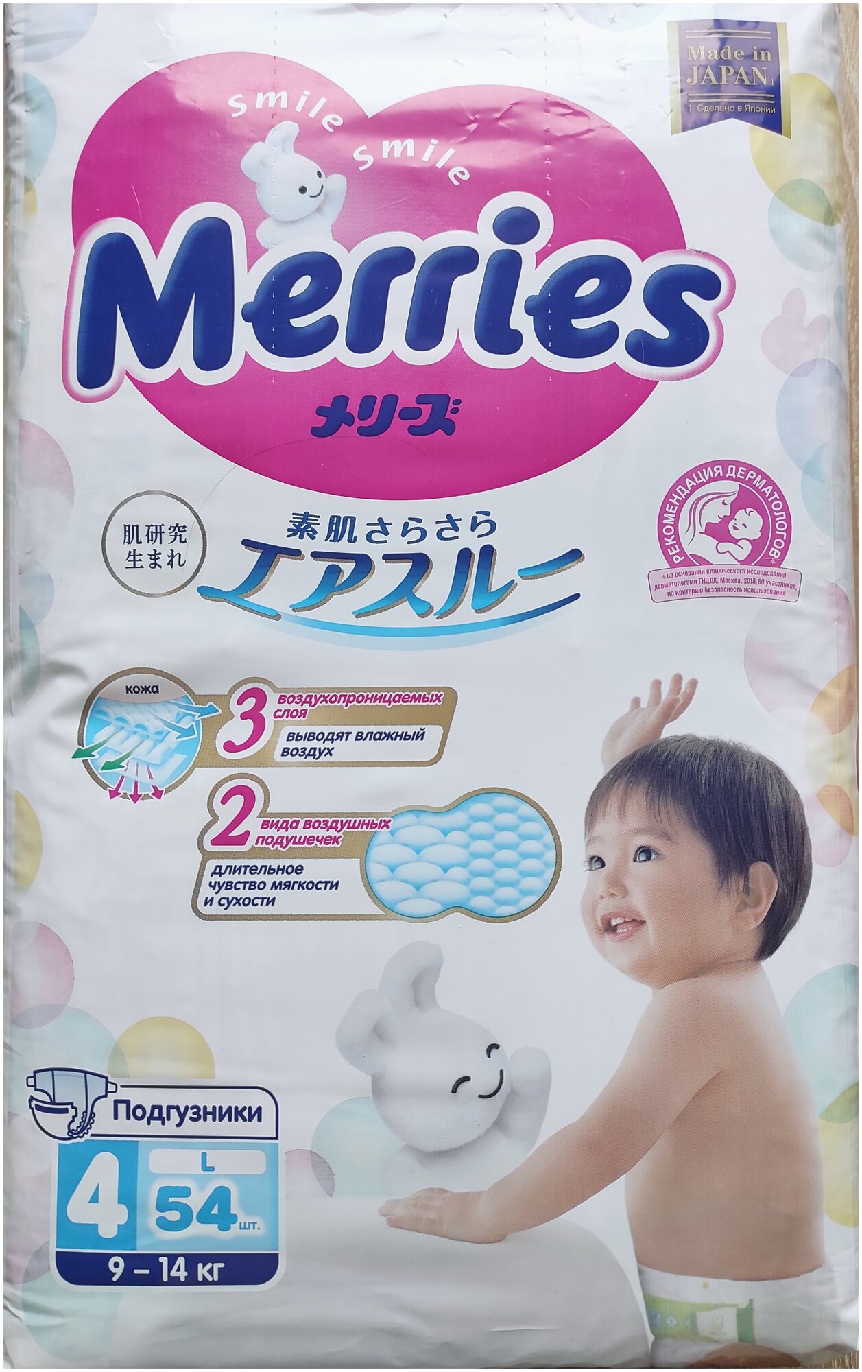 Купить Подгузники Merries для детей размер L / 4 (9-14 кг), 54 шт, дышащие с доставкой по всей России. Подгузники Merries для детей размер L / 4 (9-14 кг), 54 шт, дышащие: сравнение цен, характеристики, фото, актуальное наличие и цены.