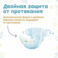 боковые внутренние бортики, большая упаковка, индикатор наполнения, рельефная внутренняя поверхность, эко-подгузники, эластичные резинки вокруг ножек, эластичный пояс