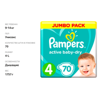 Купить Подгузники Pampers Active Baby-Dry, 9-14 кг, размер 4, 70 шт с доставкой по всей России. Подгузники Pampers Active Baby-Dry, 9-14 кг, размер 4, 70 шт: сравнение цен, характеристики, фото, актуальное наличие и цены.