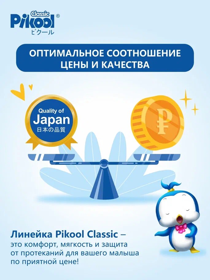 Подгузники Pikool Classic, размер L (9-14 кг), 4 х 64 шт/ 256 шт.: сравнение цен, характеристики, фото, актуальное наличие и цены.
