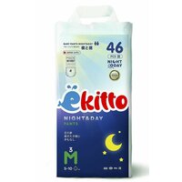 Ekitto M - размер, подходящий для детей весом от 5 до 10 килограмм. В упаковке 46 штук. Подгузник подходит для девочек и для мальчиков. Он универсален и может быть использован как в качестве подгузника, так и в качестве трусиков.