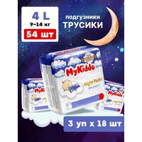 Подгузники трусики 4 L, ночные, для детей 9-14 кг, MyKiddo, Night, мегабокс 54 шт. (3 упаковки по 18 шт.): сравнение цен, характеристики, фото, актуальное наличие и цены.