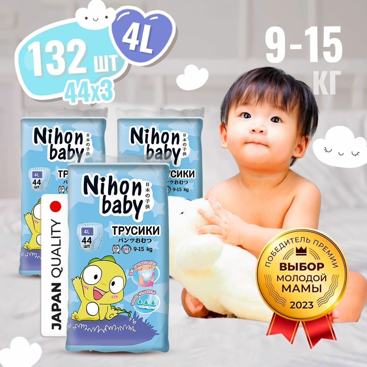 Подгузники трусики 4 размер детские Nihon baby, 132 шт, L (9-15 кг), ночные и дневные, одноразовые дышащие с индикатором влаги для детей, мальчиков и девочек / 3 упаковки по 44 штук: сравнение цен, характеристики, фото, актуальное наличие и цены.