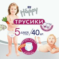 Дышащие подгузники - трусики Happy JUNIOR размер 5 (для малышей весом 11-18 кг) обеспечивают доступ воздуха к коже малыша, предотвращая опрелости и минимизируя риск возникновения раздражений. Они так же удобны, как детское белье, не ограничивают движения малыша и не вызывают раздражения. Специальный нетканый материал ускоряет распределение влаги по всей поверхности трусиков и обеспечивает чувство сухости. Надеть и снять трусики - быстро и легко для удобства родителей и малыша, который сразу вернётся к своим играм. Трусики легко снять, разорвав по шву. Современная конструкция обеспечивает отличное впитывание и плотное прилегание к телу малыша, создавая комфорт при движении и во время сна. Трусики имеют особо мягкий эластичный поясок. Разработанные для очень простого надевания и снятия, трусики помогают перейти к следующему этапу развития, когда малыш приучен к горшку. Быстрое и лёгкое использование - это способ быстро сменить трусики и вернуться к игре.