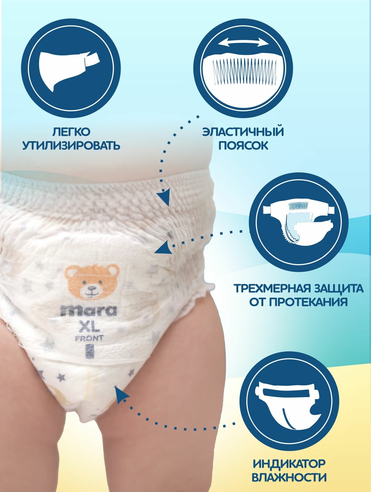 Изделия санитарно-гигиенические разового использования для детей: Подгузники-трусики детские с товарным знаком «Mara» («Мара»). Способ применения: Трусики имеют переднюю и заднюю стороны. Выбрав нужную сторону и растянув трусики с обеих сторон, оденьте на ребенка. Натяните трусики до уровня пупка, таким образом, чтобы не образовывались щели в районе бедер. Трусики являются одноразовым продуктом и не подлежат стирке. Рекомендуюется менять трусики не менее 4-6 раз в день. После использования утилизировать как бытовые отходы, завернув испачканную сторону внутрь. Не выбрасывать трусики в канализацию. Срок годности: 3 года с даты производства, указанной на упаковке. Хранить в сухом помещении, в защищенном от влаги месте, недоступном для детей. Внимание! При обнаружении чувствительности к компонентам прекратите использование. Выбор подходящих по размеру подгузников остается на усмотрения родителя. Необходимо учитывать не только вес ребенка, но и другие особенности телосложения ребенка. Рекомендуем менять размер подгузников в случае, если подгузники сдавливают живот, ножки ребенка, оставляя соответствующие следы и полосы на теле. Состав: полиэстер, целлюлоза, нетканый материал, абсорбирующие полимеры