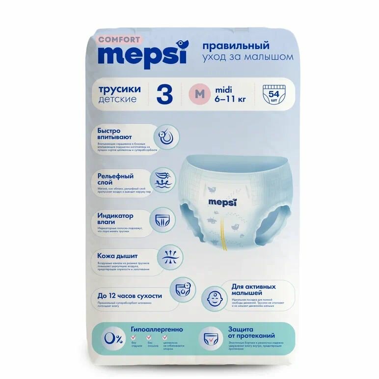 Подгузники-Трусики детские Mepsi Comfort 3, М (6-11 кг), №54: сравнение цен, характеристики, фото, актуальное наличие и цены.