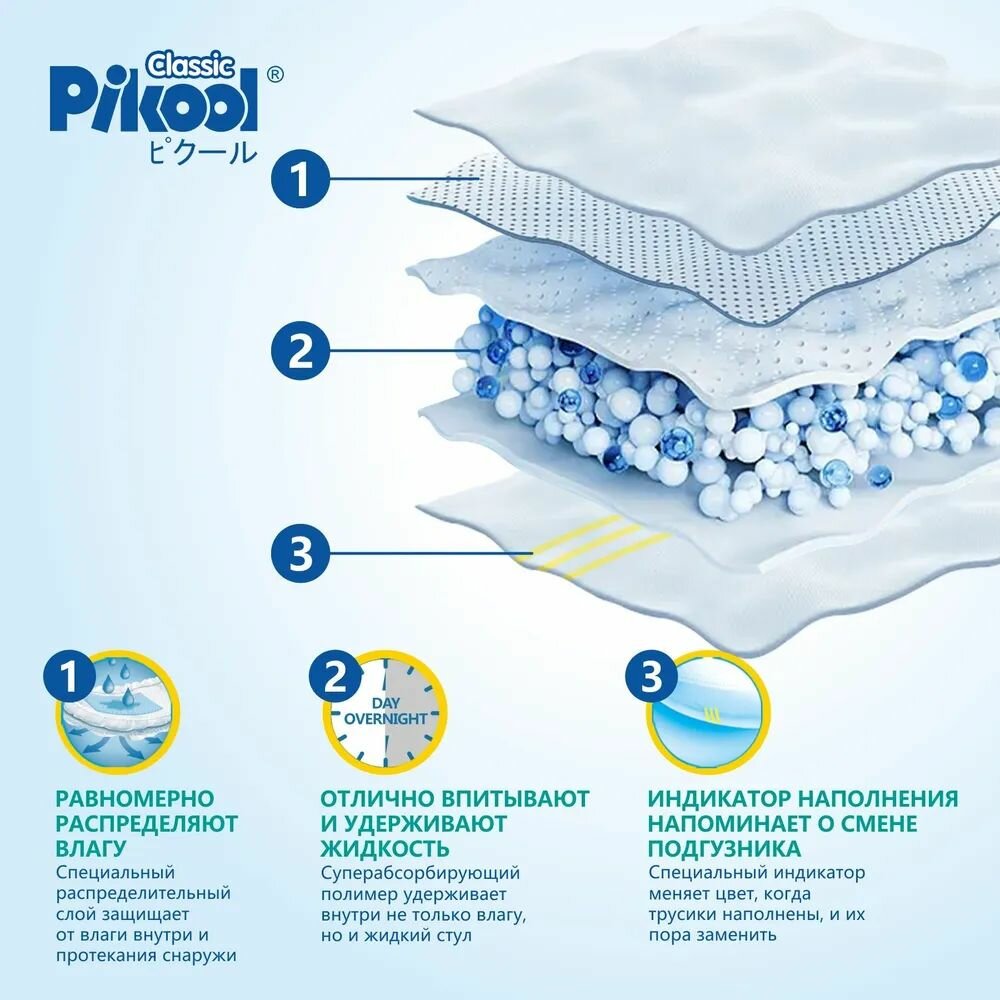 Pikool Classic (Пикул Классик). Линейка продуктов для детей с оптимальным соотношением цены и качества. Современные материалы и внимание к деталям изделий делают продукты линейки Classic удобными, функциональными и безопасными для малышей. Максимальная впитываемость. Большое количество суперабсорбирующего полимера. Индикатор впитываемости. Показывает когда необходимо заменить подгузник. Распределительный слой. Равномерно распределяет влагу внутри подгузника. Тянущаяся спинка. Обеспечивает более плотное прилегание. Двойные защитные манжеты. Предотвращают протекание вокруг ножек. Отбеленная без хлора распушенная целлюлоза, суперабсорбент (ЅAP), нетканый материал, полиэтилен, плавкий клей.