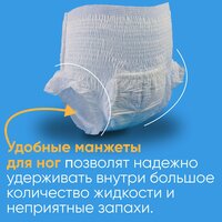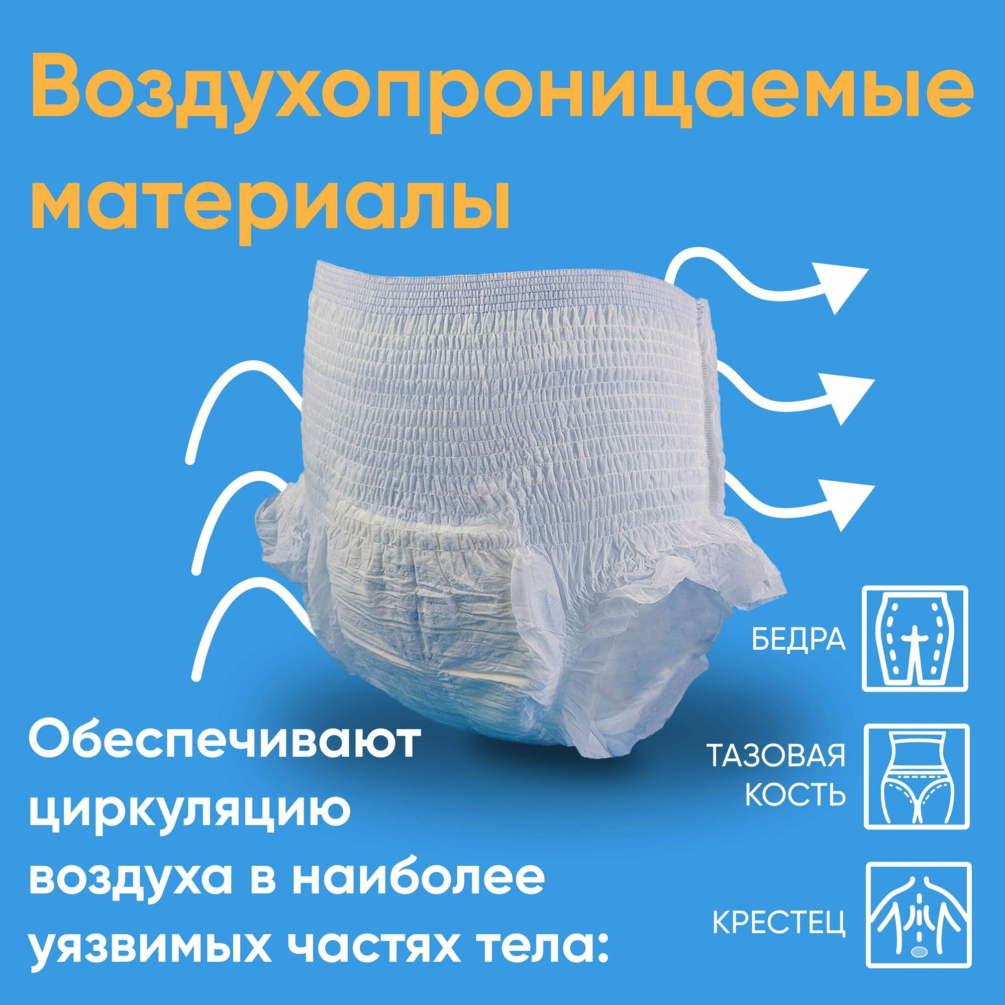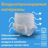 Подгузники для взрослых Yibero подойдут для людей, страдающих средней и тяжелой формами недержания, а также подойдут для людей, ведущих активный образ жизни. Памперсы для взрослого обеспечивают моментальное впитывание, удержание влаги и блокировку неприятных запахов. В упаковке находится 10 шт одноразовых подгузников. Медицинские изделия для ухода за лежачими больными и людьми с ограниченной подвижностью эффективно впитывают влагу, защищают днем и ночью. Внешний слой каждого взрослого подгузника выполнен из мягкого дышащего материала (хлопка), который приятен к телу и предотвращает появление раздражений и опрелостей на коже. Воздухопроницаемые материалы обеспечивают циркуляцию воздуха в наиболее уязвимых частях тела: в области бедер, тазовых костей и крестца. Трусики подгузники для взрослых имеют удобный эластичный пояс. Суперабсорбирующий слой обеспечивает быстрое впитывание, а двойная защита от протекания и удобные манжеты для ног позволят надежно удерживать внутри большого количества жидкости и неприятных запахов. Верхний слой подгузников: Нетканый материал; Внутренний слой: пух, целлюлоза, САП, ткань; Нижний слой: тканевая подложка. На лобной части подгузников трусиков есть синяя линия, по которой можно определить переднюю и заднюю часть. Синяя лента должна находиться сзади. Универсальные подгузники трусики подходят как мужчинам, так и женщинам. Трусики можно одевать и снимать несколько раз, в случае сохранения его сухим. Мягкий материал ночных и дневных памперсов для взрослых Yibero делает их поверхность приятной на ощупь, не создает неприятных ощущений во время использования, а удобные гидрофобные внутренние боковые бортики дополнительно защищают от протекания. Применение трусиков подгузников для взрослых: 1. При надевании на лобной части есть синяя линия, по которой можно определить переднюю и заднюю часть. Убедитесь, что синяя лента находится сзади. 2. Снимайте как обычные трусы или отрывайте со помощью перфорации со стороны пояса. 3. Если произошла дефекация, разорвите обе стороны, одной рукой придерживая низ, затем потяните. 4. Переверните использованные трусы-подгузники снизу вверх, используйте специальную наклейку для последующей утилизации. Размер памперсов трусиков М (760*590 мм) имеет впитываемость 2000 мл обхват талии 86-130 см, размер трусиков L (800*710 мм) - 2200 мл обхват талии 100-145, размер XL (880*850 мм) - 2500 мл обхват талии 115-165 см.