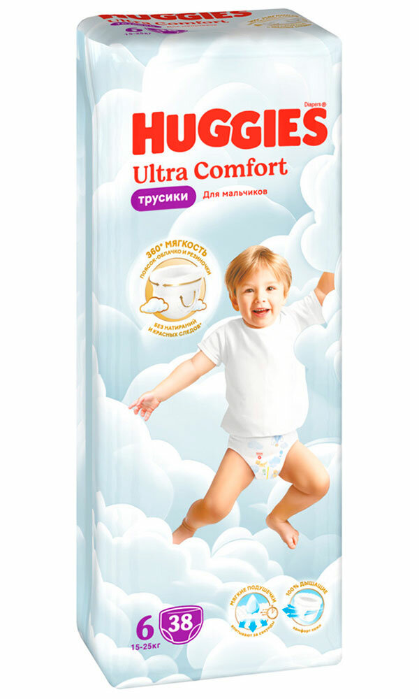 Новые подгузники-трусики Huggies Ultra Comfort для мальчиков дарят мягкость на 360°: ультрамягкие внутри и снаружи, они словно облачко обнимают вашего малыша. Сделанные из нежных материалов резиночки вокруг ножек и воздушный поясок-облачко снижают давление на кожу и риск появления натираний и красных следов даже при длительном ношении, при этом надёжно фиксируя трусики на ребёнке.