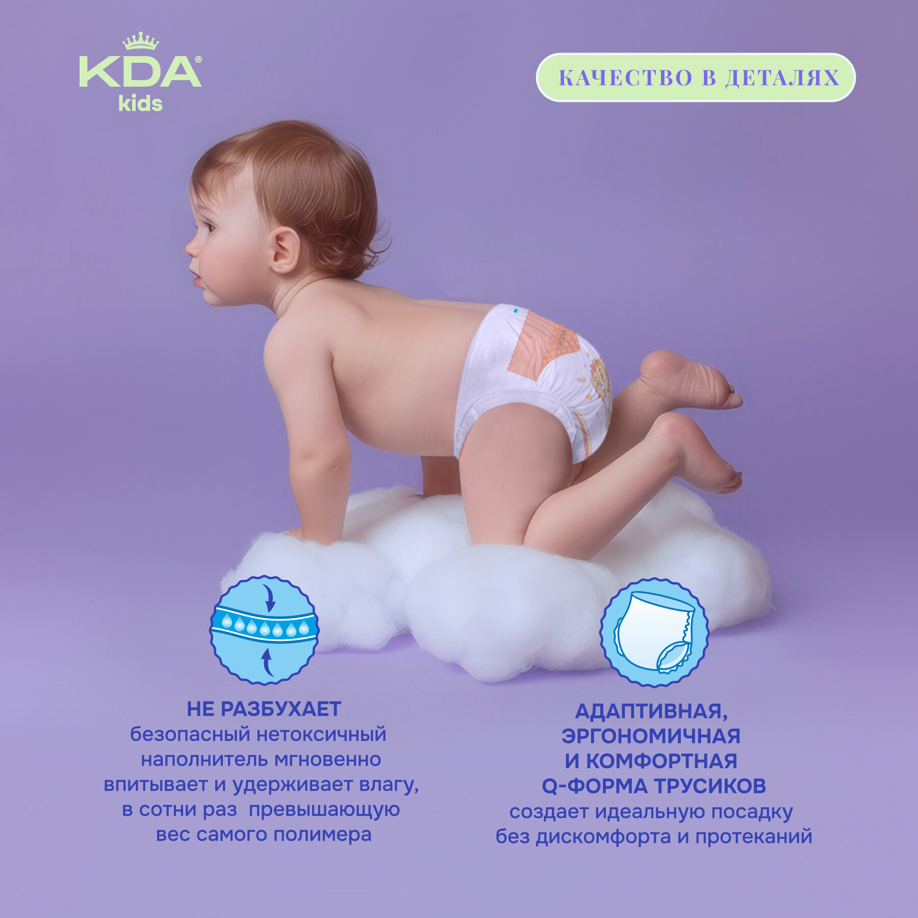 КДА ультратонкие - подгузники-трусики высоких технологий. Все самые современные разработки для исключительной защиты и комфорта вашего малыша. Тончайшие и невесомые: трусики толщиной всего … мм буквально не ощущаются на коже. 12 часов защиты Безопасный ультратонкий наполнитель (SAP) мгновенно впитывает до 500 мл жидкости и удерживает влагу, в сотни раз превышающую вес самого полимера. Технология «Fix-form» предотвращает деформацию наполнителя и образование комков. Ультрамягкое внешнее и внутреннее покрытие обеспечивает нежнейшее прикосновение даже к самой чувствительной коже. Новая система циркуляции воздуха «Air-into» Миллионы микроотверстий сохраняют постоянную свободную циркуляцию воздуха, выпускают испарения, защищая от опрелостей. Адаптивная/эргономичная/комфортная Q-форма трусиков создает идеальную посадку без дискомфорта и протеканий. Безупречное прилегание: поясок и манжеты особенной формы не оставляют следов, не сползают и не натирают. Высокоточный индикатор влаги для своевременной замены подгузника. Универсальный впитывающий слой расположен по всей поверхности: подходит для мальчиков и девочек.