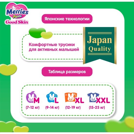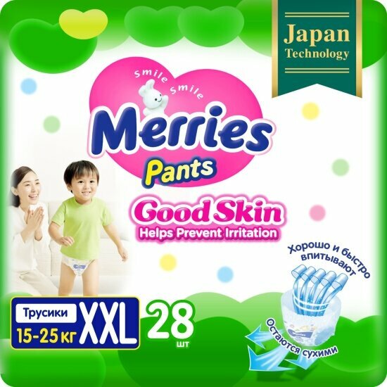 Купить Подгузники-трусики Merries Good Skin размер XXL (15-25 кг) 28 шт с доставкой по всей России. Подгузники-трусики Merries Good Skin размер XXL (15-25 кг) 28 шт: сравнение цен, характеристики, фото, актуальное наличие и цены.