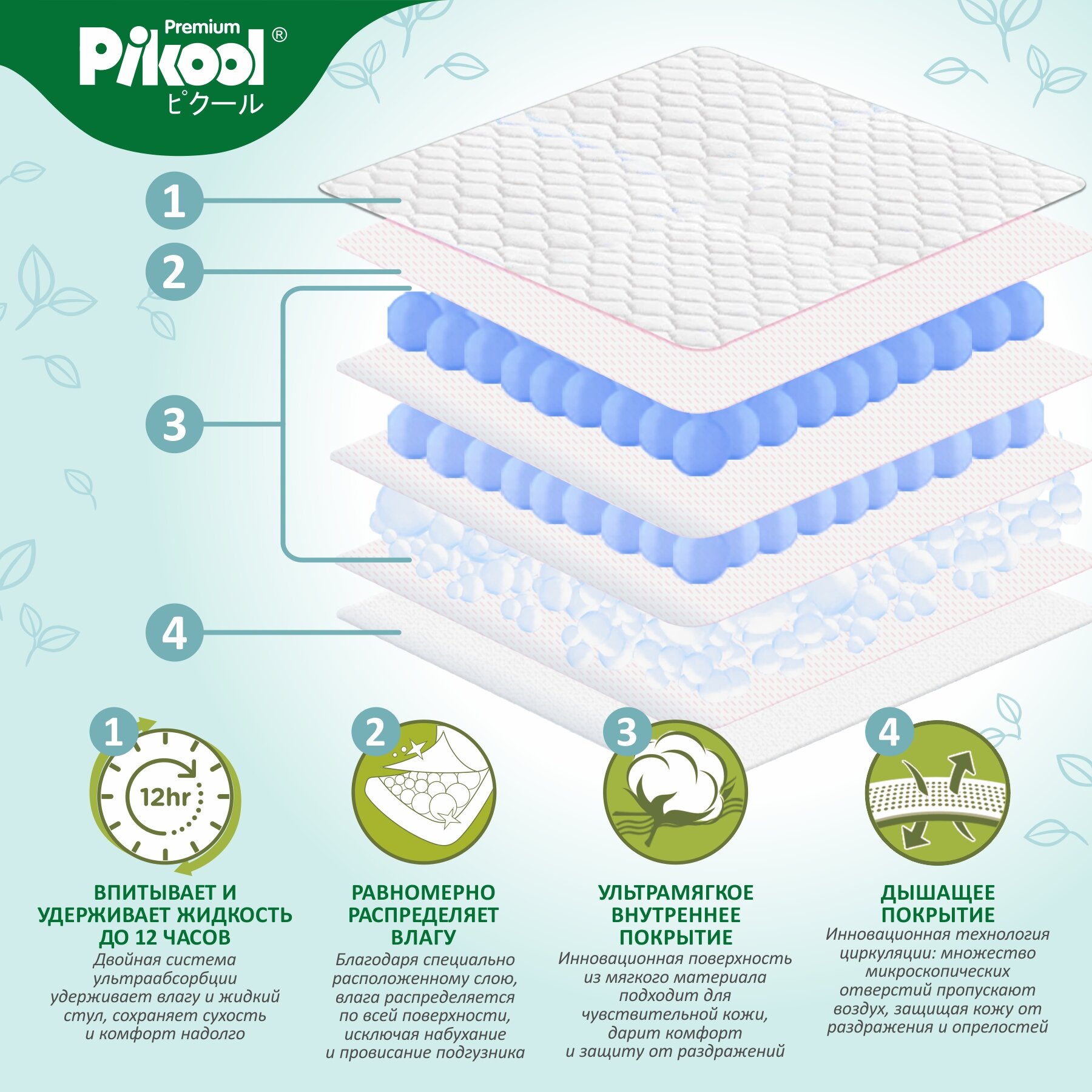 Детские подгузники Pikool изготовлены по уникальной японской технологии из распущенной целлюлозы, суперабсорбента SAP и нетканого медицинского материала. Подгузники очень мягкие, нежные и абсолютно безопасны для Вашего малыша. Благодаря уникальной японской технологии производства, подгузники Pikool имеют ряд важных преимуществ: