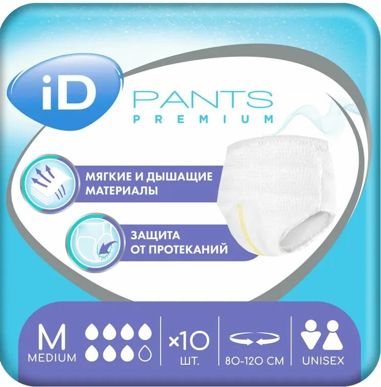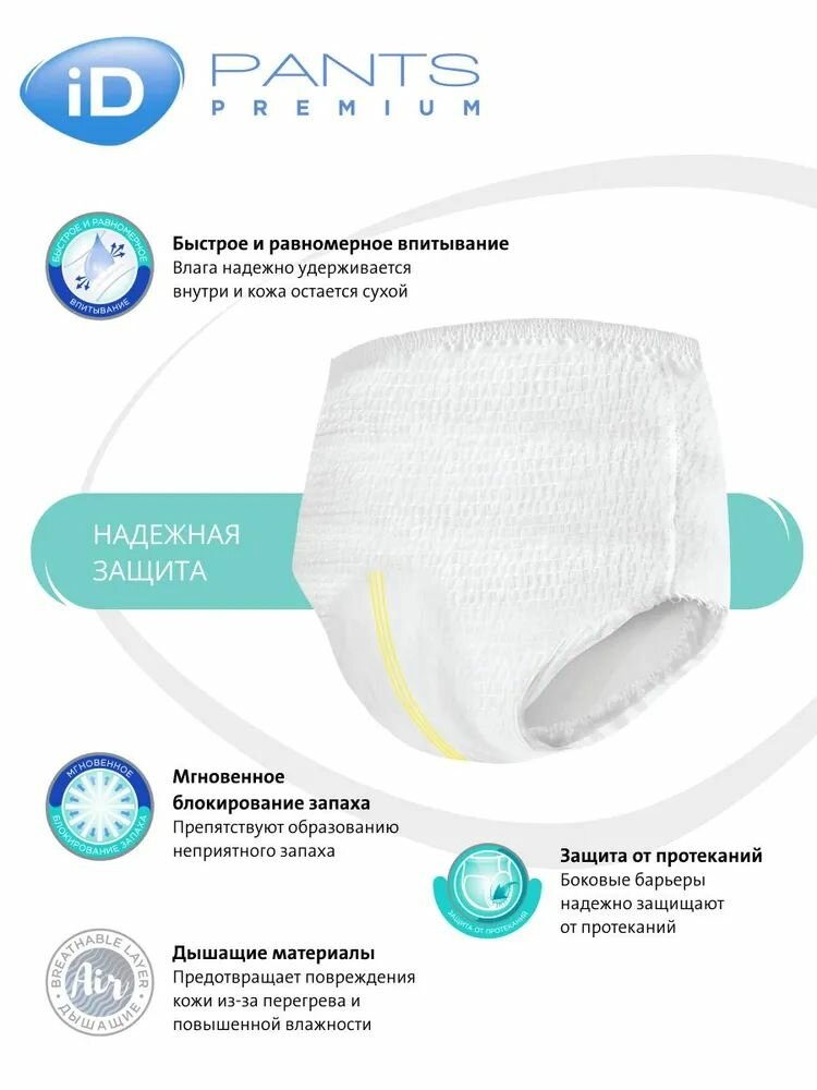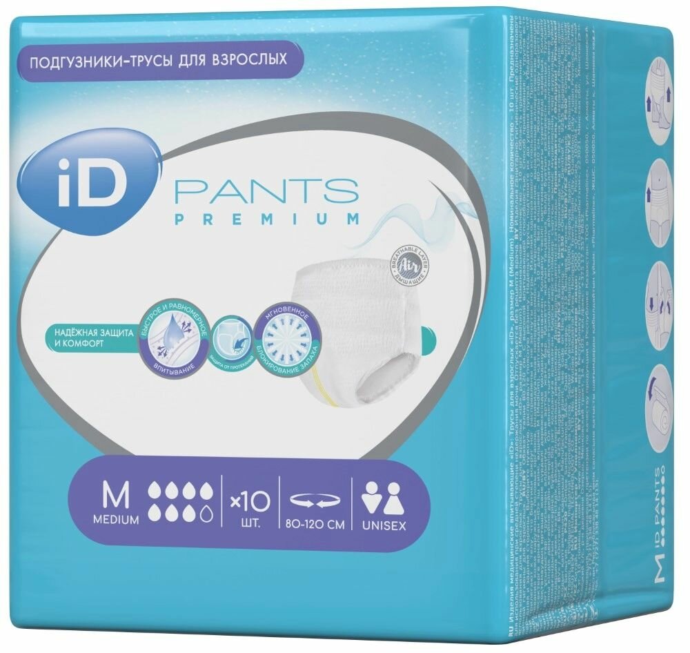 Подгузники-трусы iD PANTS напоминают обычное белье, они идеально прилегают к телу, незаметны под одеждой и не стесняют движений. Это прекрасное решение для использования при средней и тяжелой степени недержания для людей, ведущих активный образ жизни. Они обеспечивают моментальное впитывание и удержание влаги, благодаря чему кожа остается сухой, отличную защиту от протеканий и блокирование неприятных запахов. Мягкие, как хлопок, материалы дарят ощущение комфорта.