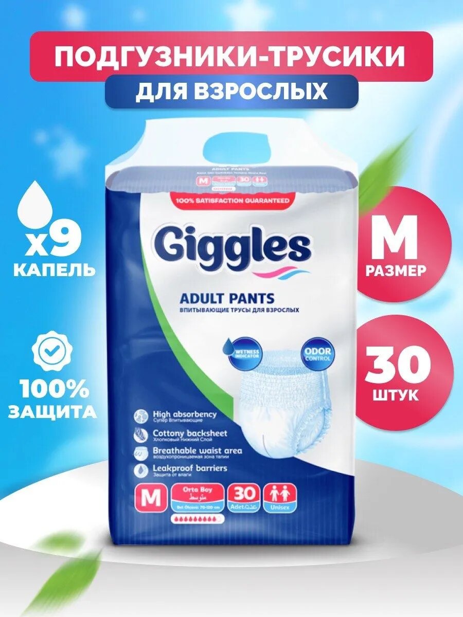 Подгузники-трусы, впитывающие памперсы для взрослых Giggles, размер М, 30 штук: сравнение цен, характеристики, фото, актуальное наличие и цены.