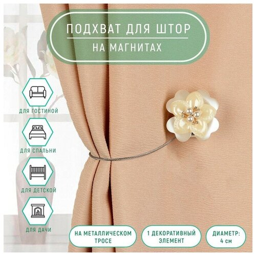 Подхват для штор «Роза», d = 4 см, цвет белый Чтобы комната стала светлее, распахните шторы. Удерживать их в понравившемся вам положении поможет подхват на магнитах. Тонкий тросик мягко опоясает текстиль и не будет бросаться в глаза. Фиксатор украсит конструкцию и станет гармоничным дополнением интерьера. Аксессуар легко снимается и надевается, вы можете менять способ захвата занавесок по настроению. Состав: Магнит, металл, пластик Цвет: Белый Форма: Фигурная
