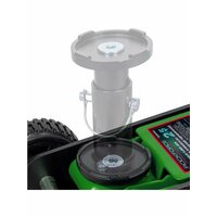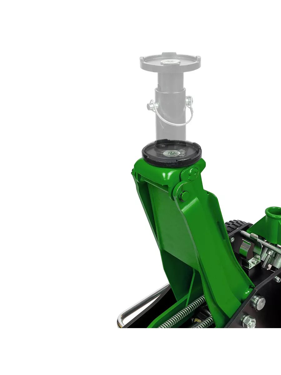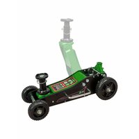 Домкрат оборудован увеличенными колесами, что позволяет работать на неровных или нетвердых поверхностях, таких как снег, песок, грязь или неровный асфальт. Удобная ручка для переноски и складная рукоять облегчают хранение и транспортировку.