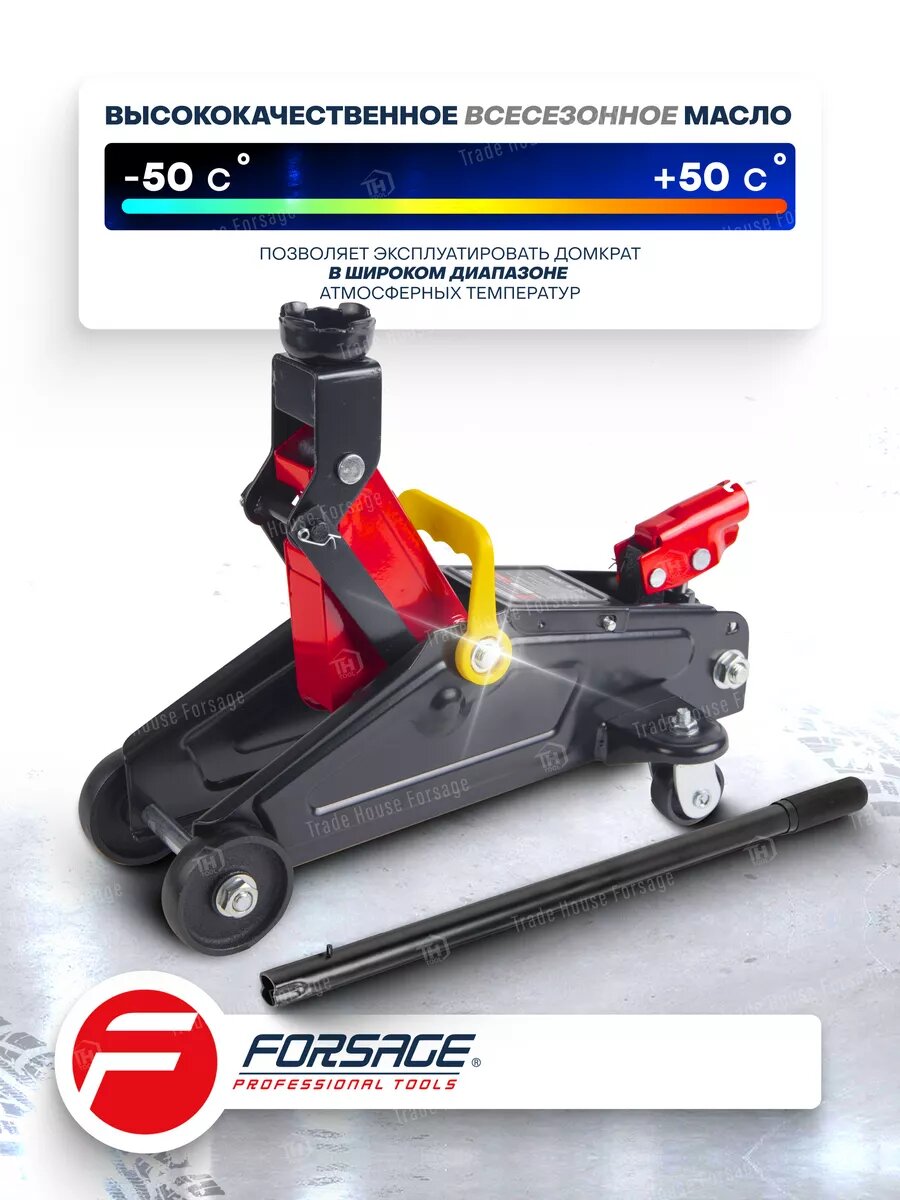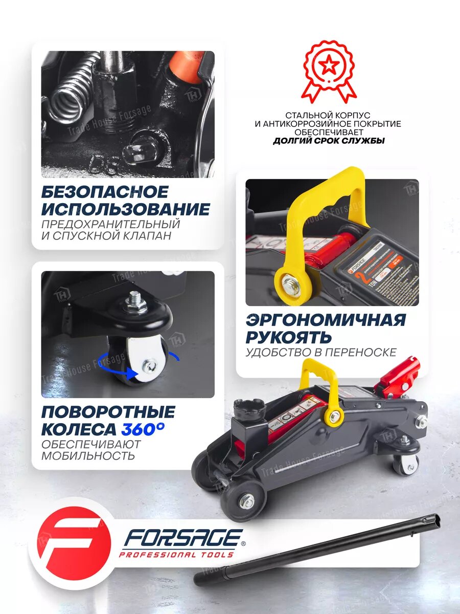Домкрат подкатной автомобильный от бренда FORSAGE является высококачественным оборудованием, которое предназначено для подъема автомобилей в автосервисах, шиномонтажных центрах по ремонту и техническому обслуживанию или в гараже. Устойчивый стальной корпус обеспечивает прочность и износостойкость.
