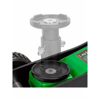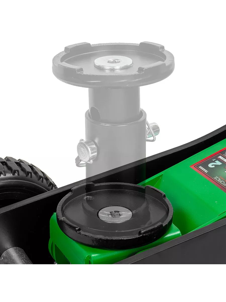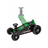 Домкрат оборудован увеличенными колесами, что позволяет работать на неровных или нетвердых поверхностях, таких как снег, песок, грязь или неровный асфальт. Удобная ручка для переноски и складная рукоять облегчают хранение и транспортировку.