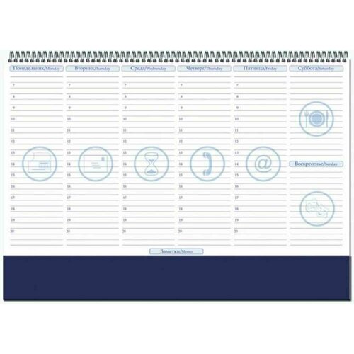 Еженедельник-планинг настольный, 490х350, недатированный, блок – офсет 80 г/м кв, печать в одну краску, прижимной клапан (синий бумвинил) снизу, на металлическом гребне, индивидуальная упаковка.