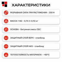 Тип битума: битумная смесь СБС Теплостойкость материала, 2 часа при температуре, ºС, не ниже 90 Гибкость материала на брусе R=25±0,2 мм, ºС, не выше -25 Водопоглощение в течение 24 часов, % масс, не более 2 Основа: битумная смесь СБС Наличие самоклеящейся кромки: да Защитный слой верхняя сторона: спанбонд Защитный слой нижняя сторона: спанбонд Разрывная сила при растяжении в продольном направлении, Н, не менее 350 Крепление: механическое.