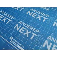 Механически закрепляемый безосновный сверхпрочный подкладочный ковер anderep next, получаемый путем нанесения битумного вяжущего с добавлением СБС полимеров на многослойную полипропиленовую ткань, с последующей защитой битумного вяжущего металлизированной несъемной пленкой. На верхнем слое Андереп некст нанесены логотипы и разметка. С нижней стороны материал имеет продольную битумную клеевую полосу, защищенную силиконизированной съемной пленкой.