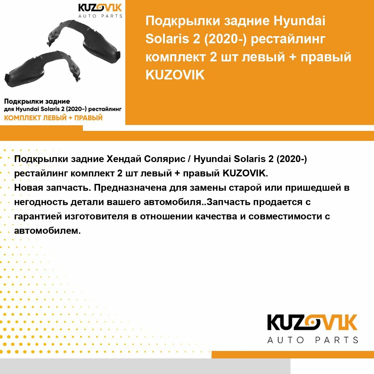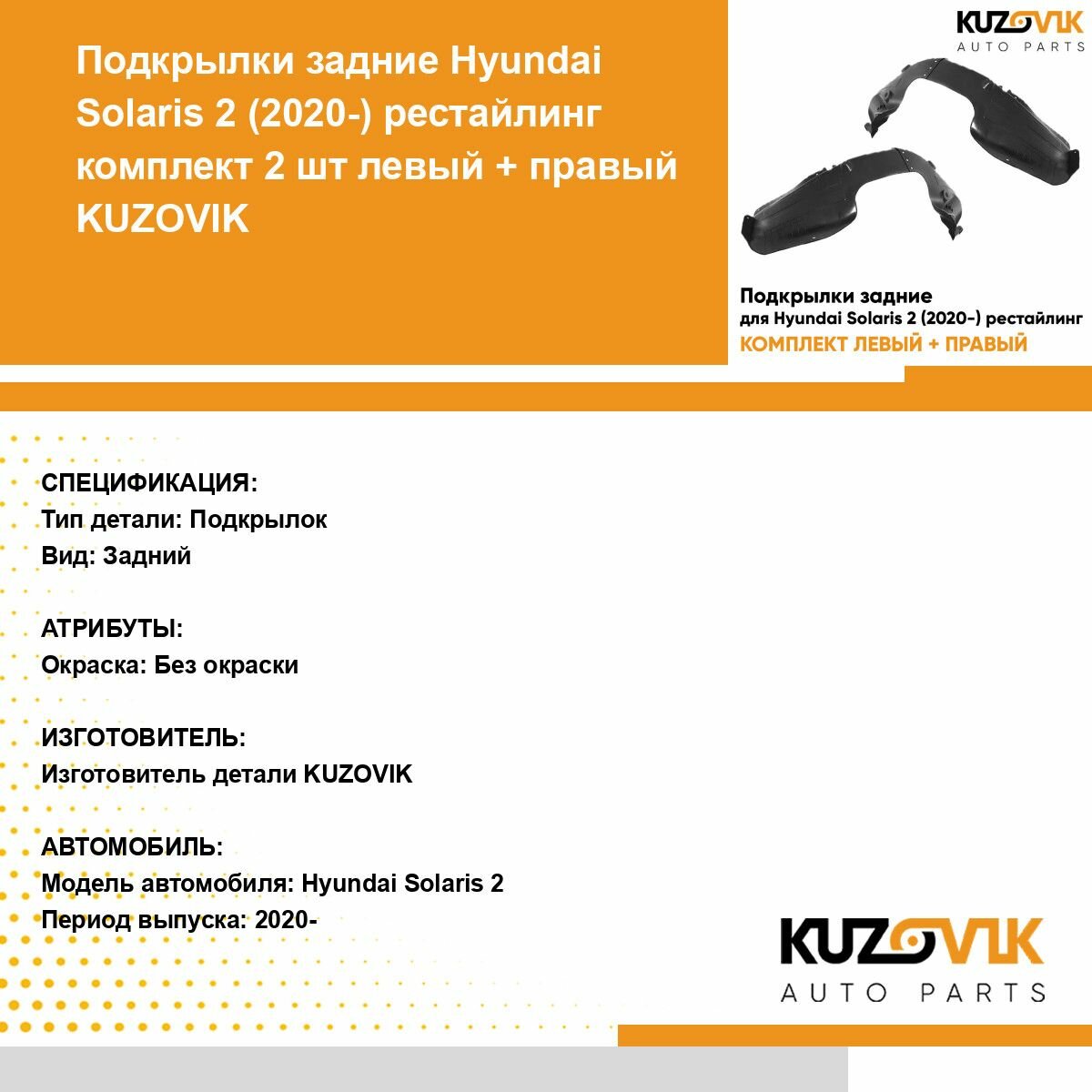 Подкрылки задние для Хендай Солярис Hyundai Solaris 2 (2020-) рестайлинг комплект 2 штуки левый+правый, локер, защита крыла: сравнение цен, характеристики, фото, актуальное наличие и цены.