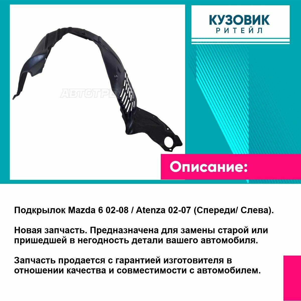 Подкрылок Mazda 6 02-08 Atenza 02-07 (Спереди Слева). Новая запчасть. Предназначена для замены старой или пришедшей в негодность детали вашего автомобиля. Изготовителем является торговая марка ATEK. Запчасть продается с гарантией изготовителя в отношении качества и совместимости с автомобилем.