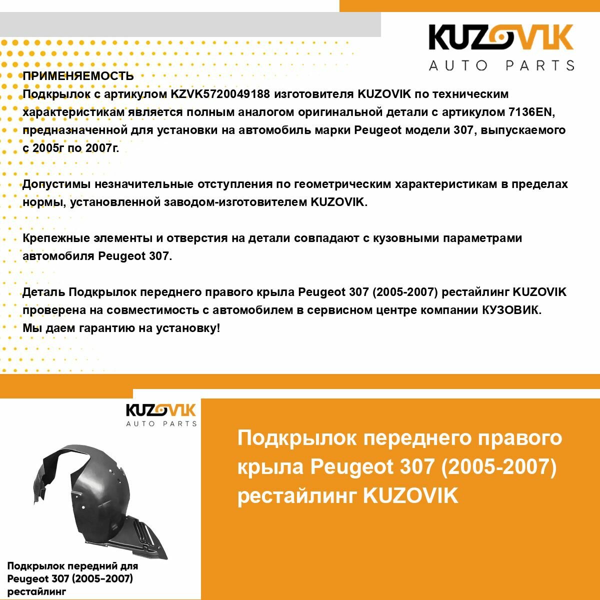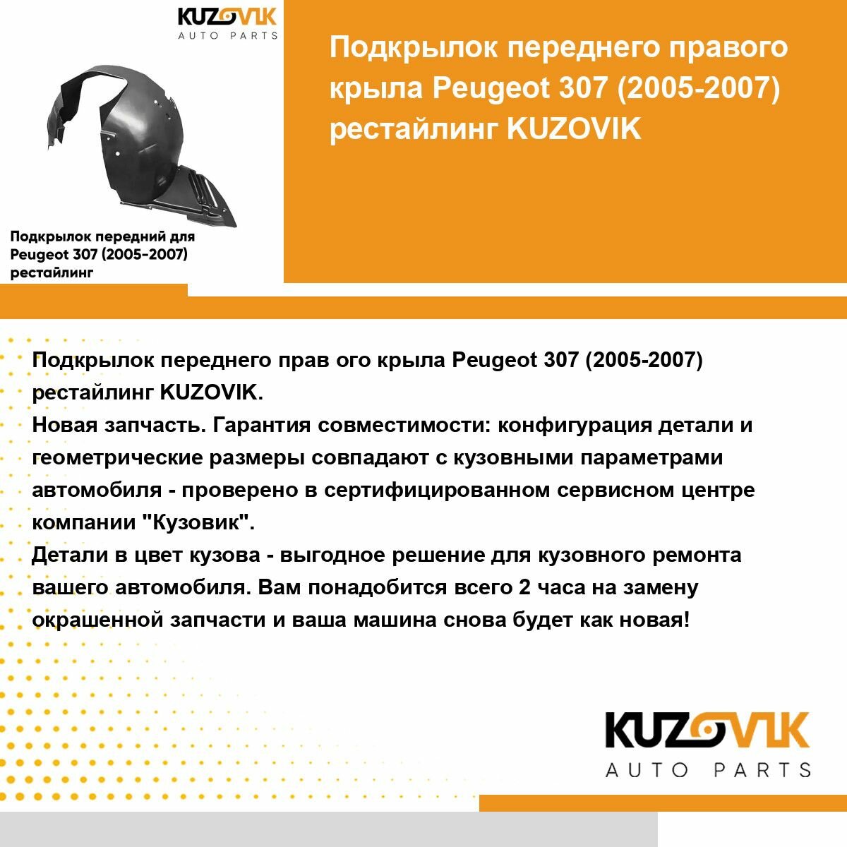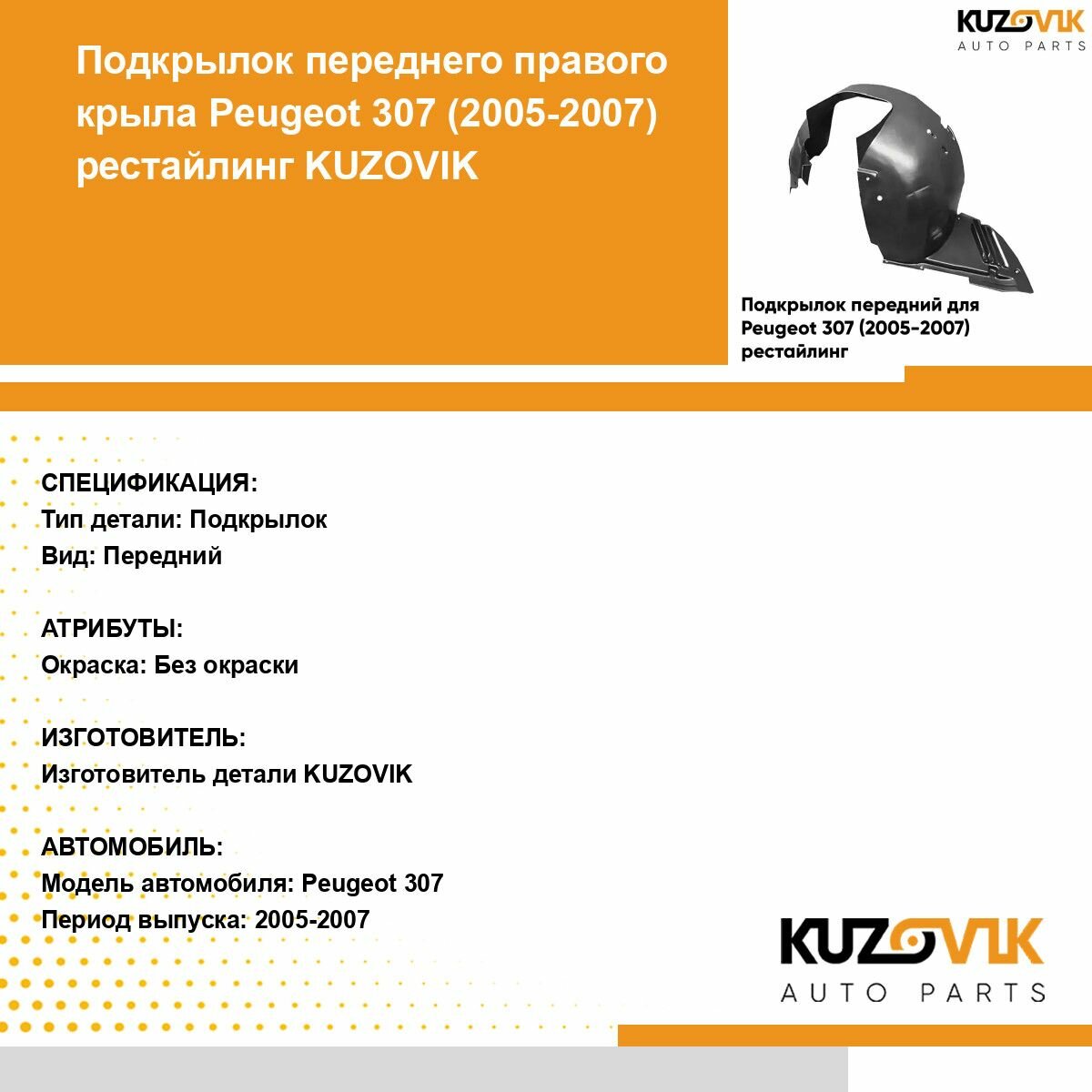 Деталь подкрылок передний для Пежо Peugeot 307 (2005-2007) рестайлинг правыйпроверена на совместимость с автомобилем в сервисном центре компании "Кузовик".