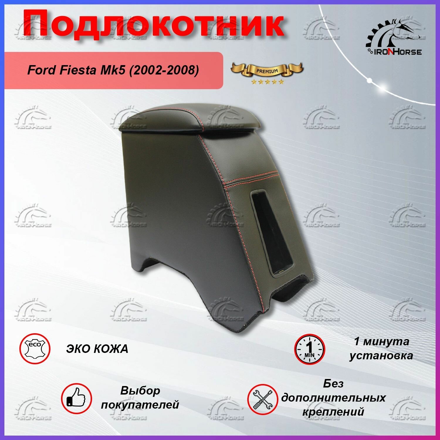 Подлокотник для автомобиля Форд Фиеста Mk5 / Ford Fiesta Mk5 красная строчка (2002-2008) — является важным и стильным аксессуаром для Вашего автомобиля. Он станет для Вас дополнительной опорой, что позволит сделать поездку менее утомительной и снять мышечное напряжение. Также это органайзер для всевозможных мелочей (денег, ключей и т. п.). Подлокотник высокого качества идеально впишется в интерьер Вашего автомобиля. Перетяжка выполнена из качественной Экокожи с перфорированной вставкой с красной строчкой. Подлокотник устанавливается без лишних крепежей и саморезов не больше одной минуты.