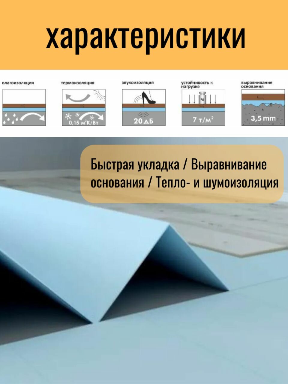 Ключевая характеристика: Быстрая укладка / Выравнивание основания / Тепло- и шумоизоляция / Антибактериальные свойства: Подложка имеет антибактерицидные и противогрибковые свойства Звукоизоляция 20 Дб Термоизоляция 0,15 м2К/Вт Устойчивость к нагрузке 7 т/м2 Выравнивание основания 4 мм Циркуляция воздуха