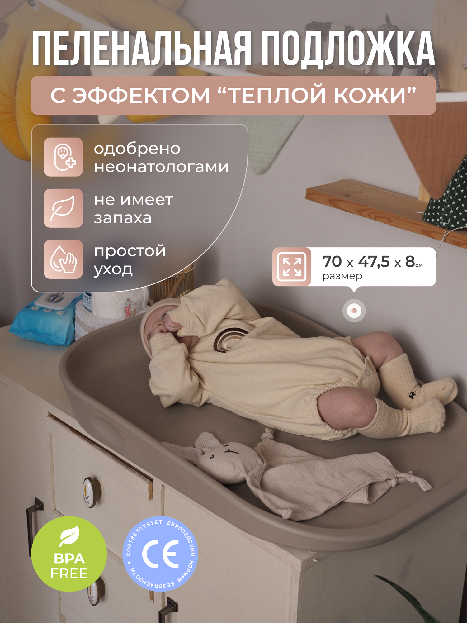 Пеленальный матрасик с эффектом «Кожа к Коже» станет незаменимым помощником в уходе за вашим малышом. • Универсальность: подходит как для пеленального столика, так и для комода, так же его можно использовать в ванной комнате, на кровати. Идеально подходит для пеленания малыша, смены подгузников, гигиенических процедур, воздушных ванн, осмотра врача, массажа и пальчиковых игр. • Безопасность: Детский матрасик с бортиками 8 см и жесткая анти-скользящая основа обеспечивают устойчивость на любой поверхности, что важно для смены подгузников, что обеспечит безопасность ребенку. • Гигиеничность: непромокаемый и водонепроницаемый матрасик легко очищается — просто протрите его влажной тканью или мягким моющим средством. Он быстро сохнет, что обеспечивает постоянную свежесть, ваш малыш всегда будет сухим и в комфортных условиях. • Комфорт: Эффект «теплой кожи» создает приятные ощущения для вашего малыша, материал гипоаллергенный, что не доставит неудобства для мягкой кожи малыша. • Легкий уход и долговечность Изготовленный из практичного 100% полиуретана, пеленальная доска обладает высокой износостойкостью и амортизирующими свойствами. Он не впитывает запахи и легко моется, быстро сохнет, что делает его идеальным выбором для заботливых родителей. • Современный дизайн. Подложка украсит любую детскую комнату, благодаря продуманному стильному дизайну и приятными современными цветам. Пеленальная подложка станет отличным подарком на рождение ребенка. Они помогут создать уютное, комфортное и безопасное пространство для пеленания и гигиенических процедур. Размер 70х47,5х8 см делает его компактным и удобным для транспортировки. А также станет отличным подарком для родителей и новорожденного. Закажите пеленальный матрас для новорожденного прямо сейчас и наслаждайтесь каждым моментом вместе с вашим малышом!