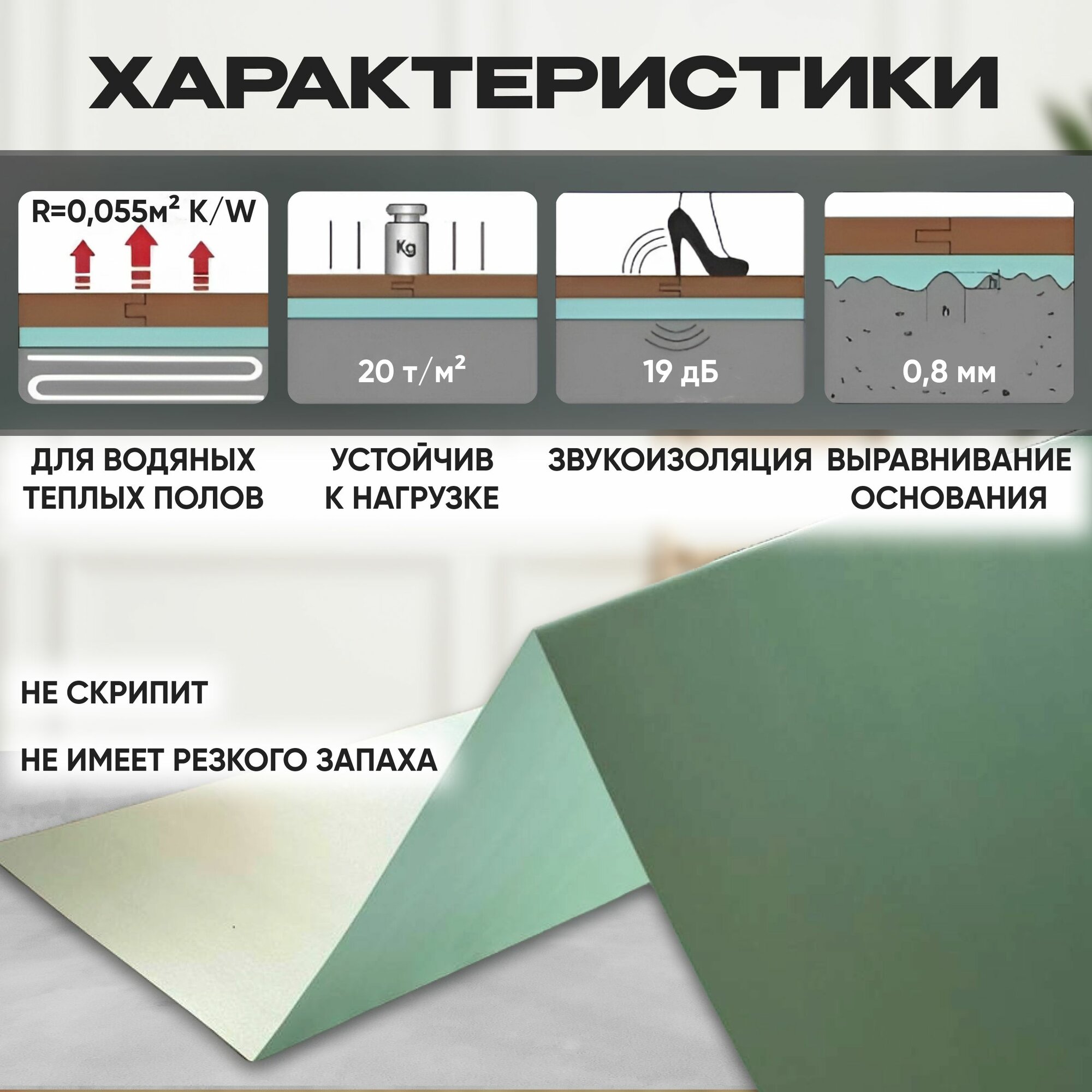 Устойчивость к нагрузке 20 т/м2 гарантирует долгий срок службы подложки. Выравнивание основания до 0,8 мм позволяет устранить мелкие неровности, что делает подложку отличным выбором для укладки на неровные поверхности.