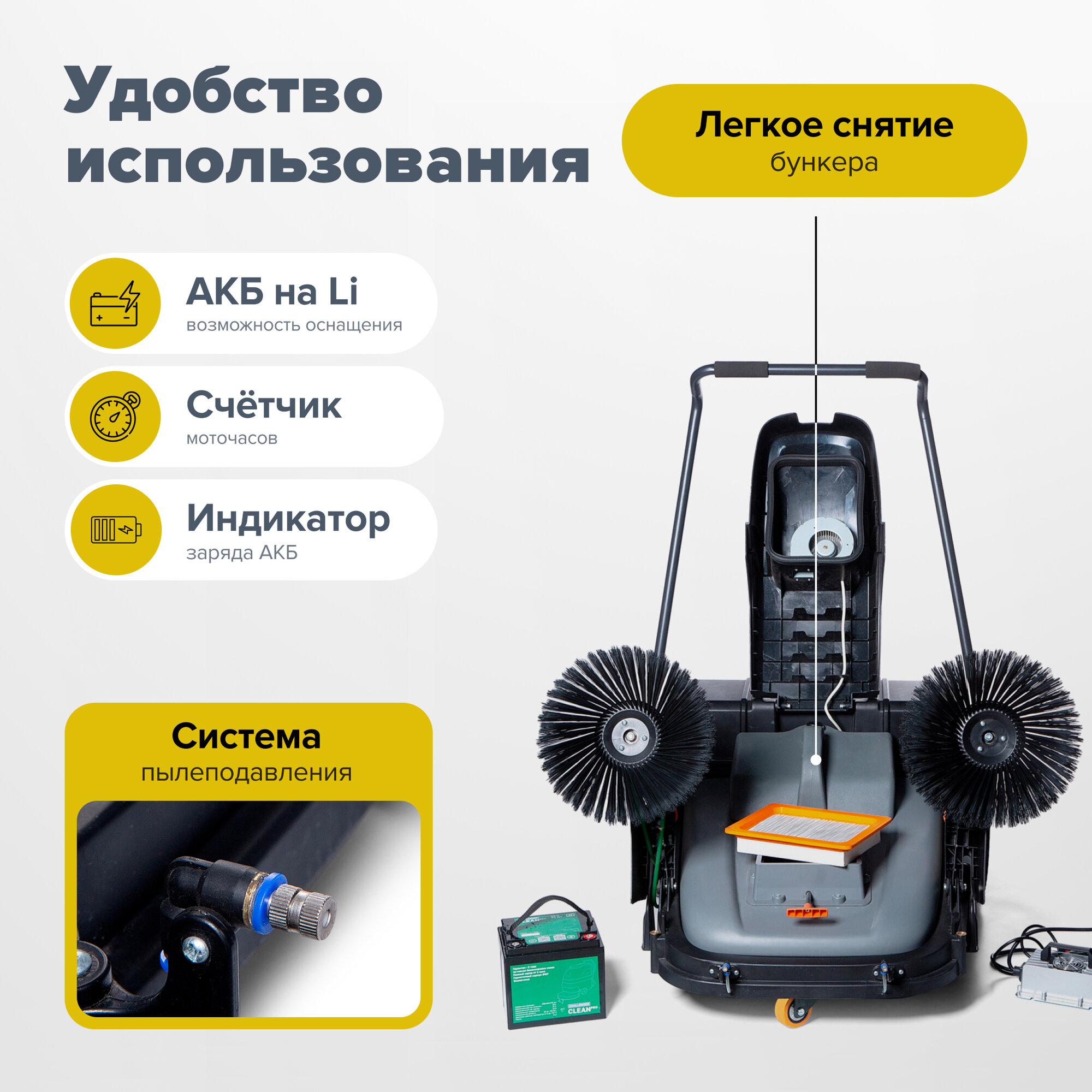 Благодаря своей компактности и маневренности, машина с легкостью убирает пыль, мусор, листья и снег даже в труднодоступных местах. Мощный аккумулятор обеспечивает до 4 часов непрерывной работы, а функция быстрой зарядки позволяет всегда быть готовым к выполнению задач.