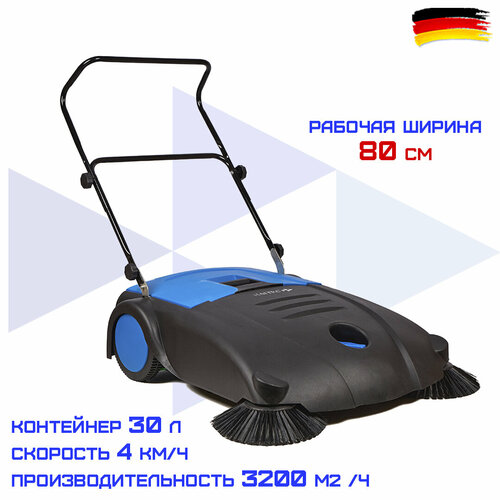 Ручная подметально-уборочная машина HT-MKM80 значительно упрощает работу по уборке мусора в сарае, на подъездной дорожке или в мастерской! Она имеет прочный корпус, изготовленный из высококачественного пластика, и может подметать до 3200 м2 в час. Кронштейн для привода разборный, поэтому вы можете компактно хранить подметальную машину. Машина позволяет очищать тротуары, проезды, парковки, дорожки до 7 раз быстрее, чем при использовании традиционных методов уборки. Машина оснащена очень прочной рамой из стальных трубок 20 мм и вместительным контейнером для мусора на 30 л. Благодаря двум передним и двум задним роликовым щеткам эта компактная подметальная машина позволяет производить уборку легко и в 5 раз эффективнее стандартной уборки метлой. Два больших задних колеса диаметром 210 мм и поворотное колесо диаметром 50 мм в передней части машины делают ее очень маневренной и легкой в управлении. Основные преимущества: Рабочая ширина 800 ммРабочая скорость 4 км /чМаксимальная рабочая площадь: 3200 м2 /чВместимость контейнера 30 лДве передние круглые щетки размером 219 мм, Две задние роликовые щетки размером 84 мм, вращающиеся друг против другаПереднее колесо 1шт 50 ммЗадние колеса 2 шт. x 210 мм ХарактеристикиРабочая ширина800 ммДиаметр колес1шт 50 мм/2 шт. x 210 ммCкорость движения4 км/чВес (нетто)12,3 кгВес (брутто)14,4 кгГабариты упаковки69x34x87 смДиаметр щетки219 ммДxШxВ в собранном виде70x90x120 смОбъём мусоросборника30 л