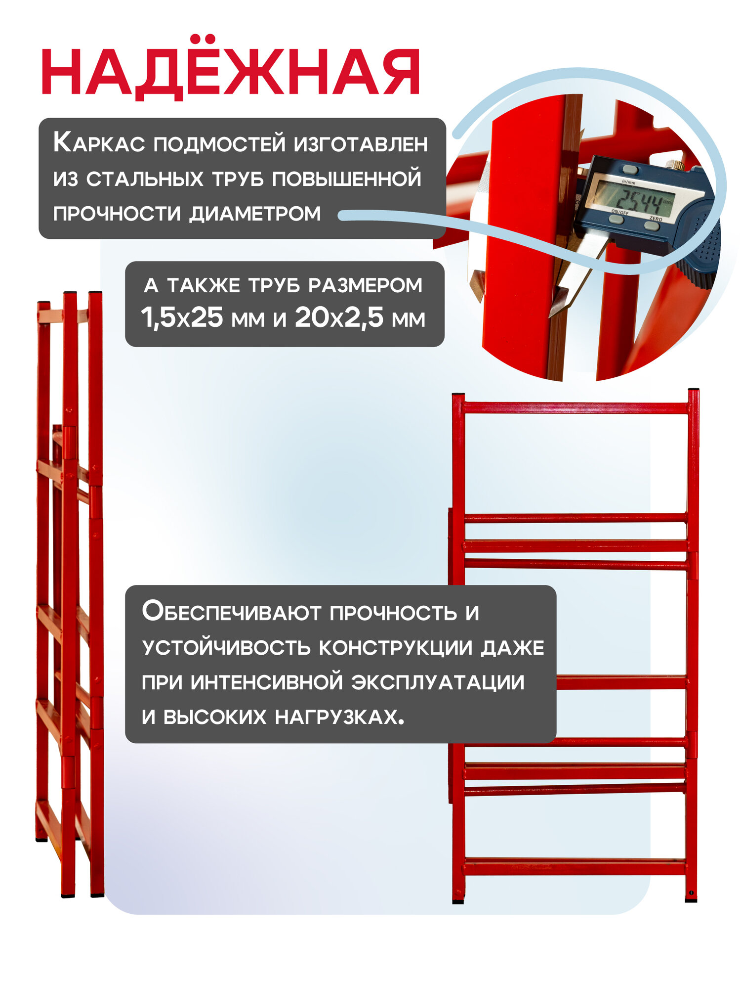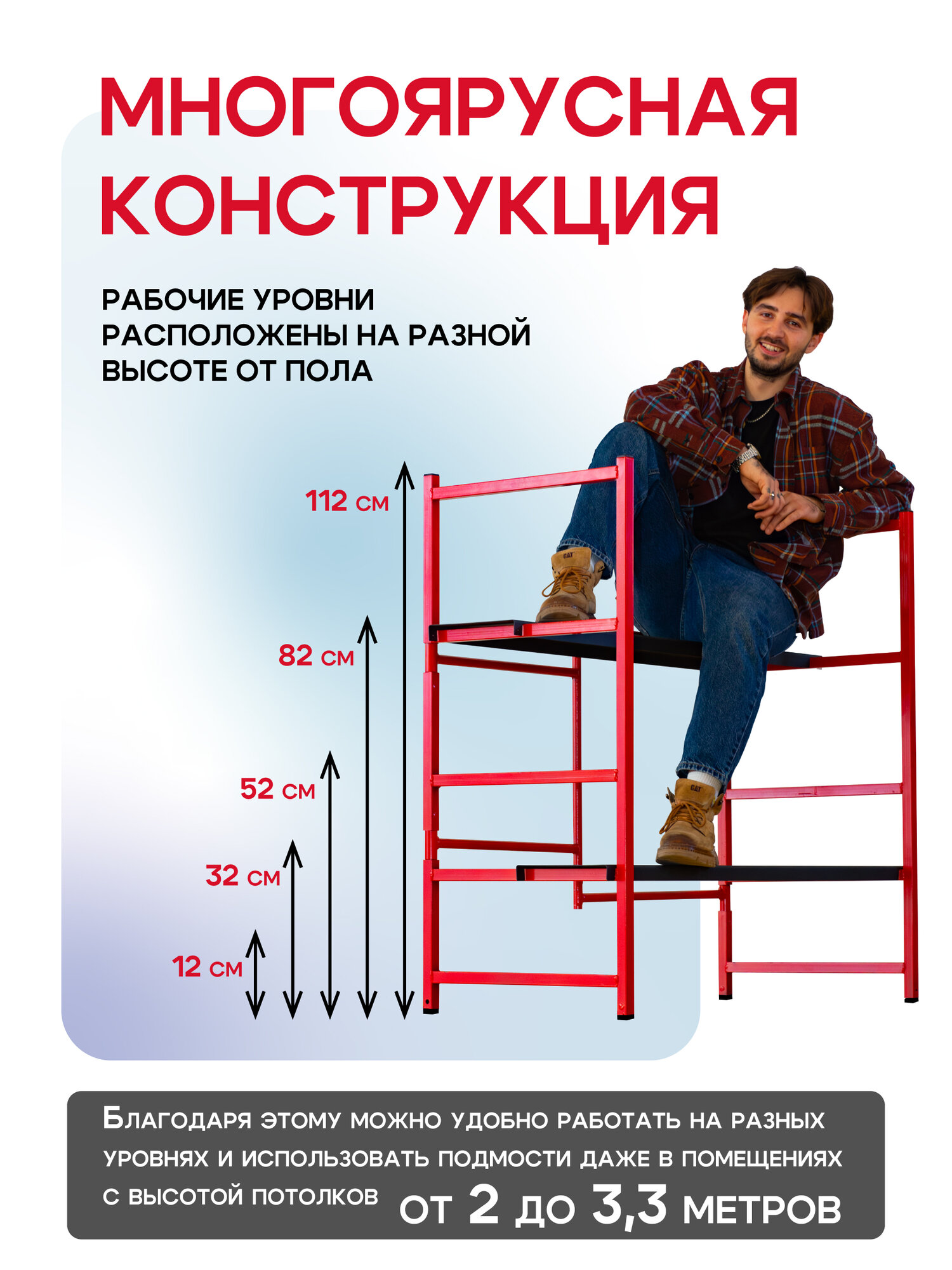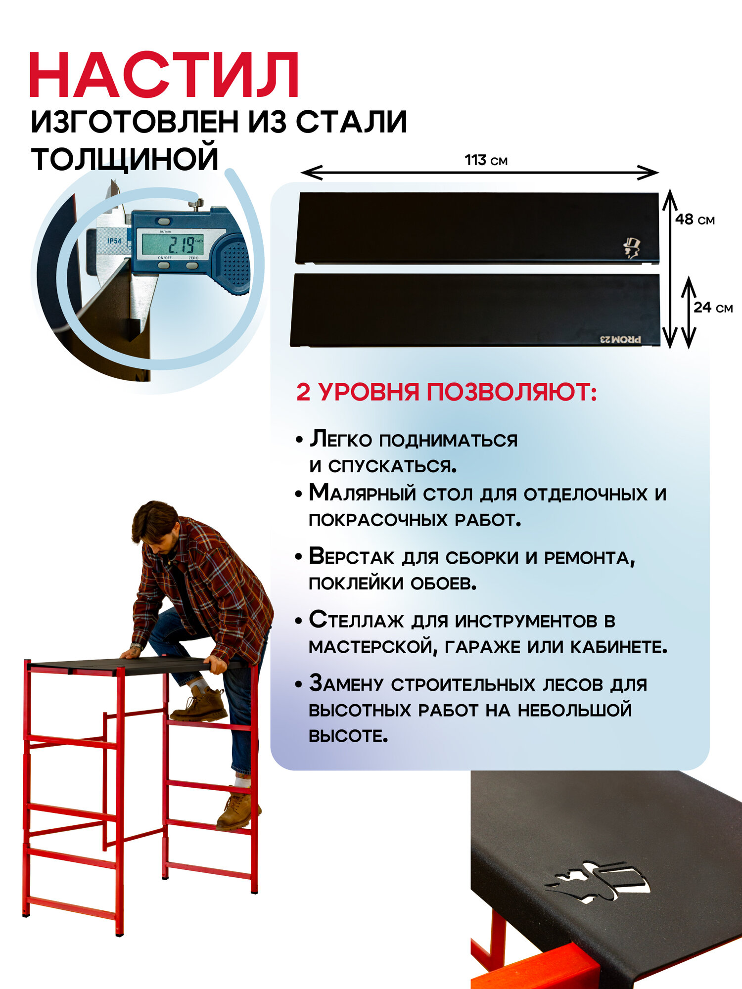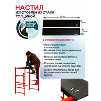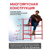 Многоярусные складные подмости Промышленник H120 без колес – устойчивость и надежность для стационарных работ. Многоярусные строительные подмости Промышленник H120 – это удобное и надежное решение для выполнения строительных, ремонтных и отделочных работ. Они предназначены для стационарного использования и не оснащены колесами, что делает их максимально устойчивыми и безопасными при работе. Благодаря компактной складной конструкции подмости удобно хранить и транспортировать в сложенном виде. Они могут заменить малярный стол, верстак, строительные подмости, вышку-туру и инструментальный стеллаж, предоставляя максимум возможностей для организации рабочего пространства. Внимание! Данная модель без колес – для стационарного использования. Ключевые преимущества: 5 уровней высоты – рабочие площадки расположены на 20 см, 40 см, 60 см, 90 см и 120 см, позволяя комфортно работать даже в помещениях с высотой потолков от 2 до 3,3 метров. Прочная рабочая площадка – настил выполнен из стали толщиной 2 мм, состоит из двух частей размером 113×24 см, которые можно закрепить на разной высоте. Усиленный стальной каркас – трубы диаметром 25 мм, а также 1,5×25 мм и 20×2,5 мм, что обеспечивает высокую прочность и устойчивость конструкции даже при интенсивной эксплуатации. Порошковая окраска – защищает от коррозии, механических повреждений и увеличивает срок службы подмостей. Складная конструкция – подмости собираются и разбираются всего за несколько минут без использования инструментов. Компактные размеры в сложенном виде – занимают минимум места, удобно хранить в небольших помещениях или перевозить в автомобиле. Применение: Малярные и отделочные работы – покраска стен и потолков, поклейка обоев, штукатурка. Строительство и монтаж – укладка плитки, установка потолочных конструкций, электромонтаж. Столярные и слесарные работы – верстак для обработки материалов. Мастерская и гараж – удобный инструментальный стол. Ремонтные и бытовые работы – доступ к сложным участкам на высоте. Технические характеристики: Высота рабочих уровней: 20 см / 40 см / 60 см / 90 см / 120 см. Размер рабочей площадки: 113×24 см (2 части). Материал настила: Сталь 2 мм. Каркас: Стальные трубы 25 мм, 1,5×25 мм, 20×2,5 мм Покрытие: Порошковая окраска (защита от коррозии). Тип конструкции: Складная, быстрая сборка и разборка. Компактность: Удобно хранить и перевозить. Многоярусные строительные подмости Промышленник H120 без колес – это прочность, безопасность и универсальность. Надежная стационарная конструкция, компактные размеры и возможность использования на разных высотах делают их незаменимыми на стройке, в мастерской или при ремонте дома. Выбирайте удобные и надежные подмости – работайте комфортно и безопасно!