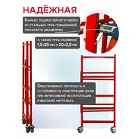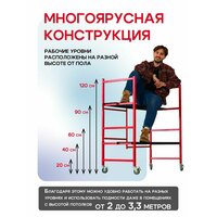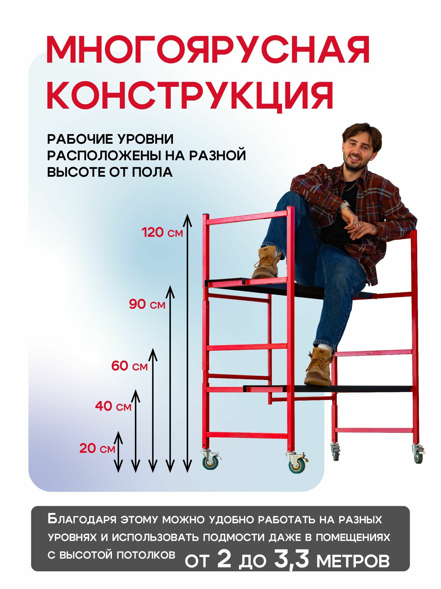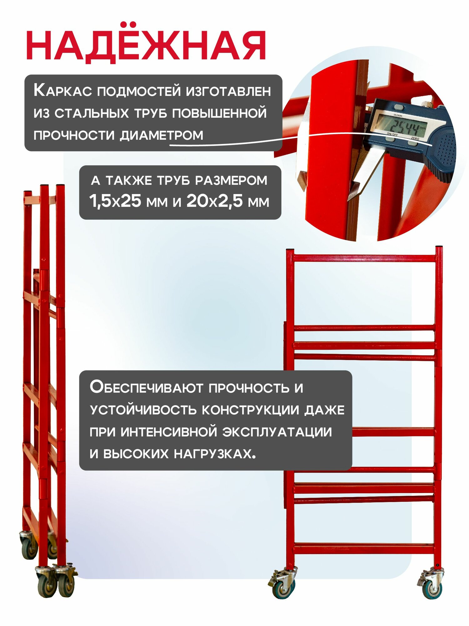 Многоярусные складные подмости Промышленник H120 – мобильность, надежность и универсальность Многоярусные строительные подмости Промышленник H120 – это профессиональное оборудование, которое обеспечивает удобство работы на высоте при ремонте, отделке и строительстве. Благодаря складной конструкции они компактны в хранении и транспортировке, а многофункциональность позволяет заменить сразу несколько рабочих поверхностей: малярный стол, строительный верстак, вышку-туру, инструментальный стеллаж. Преимущества подмостей Промышленник H120: 5 уровней высоты – 20 см, 40 см, 60 см, 90 см и 120 см, что делает работу удобной при разной высоте потолков (от 2 до 3,3 метров). Прочная рабочая площадка – настил из стали толщиной 2 мм, состоящий из двух секций размером 113×24 см. Усиленный стальной каркас – трубы диаметром 25 мм, 1,5×25 мм и 20×2,5 мм, обеспечивающие надежность при высоких нагрузках. Порошковая окраска защищает от коррозии, механических повреждений и увеличивает срок службы. Мобильность и удобство – оснащены надежными колесами для удобного перемещения по объекту. Быстрая сборка и разборка – конструкция позволяет собрать подмости всего за несколько минут без использования специальных инструментов. Компактные размеры в сложенном виде – удобны для хранения в небольших помещениях или перевозки в автомобиле. Где можно использовать складные подмости Промышленник H120? Отделочные работы – покраска стен и потолков, поклейка обоев, штукатурка. Строительные задачи – укладка плитки, монтаж потолочных конструкций, установка освещения. Столярные и слесарные работы – обработка материалов, использование как верстака. Мастерская и гараж – удобный инструментальный стол для работы с оборудованием. Ремонт и обслуживание помещений – монтажные и электромонтажные работы на высоте. Многоярусные малярные подмости Промышленник H120 – это максимальная функциональность, надежность и удобство. Конструкция с колесами, прочный каркас и складной механизм делают их незаменимым инструментом на стройке, в мастерской и при ремонте дома. С этими подмостями работать станет быстрее, комфортнее и безопаснее!
