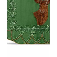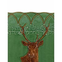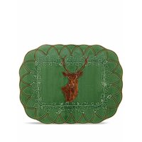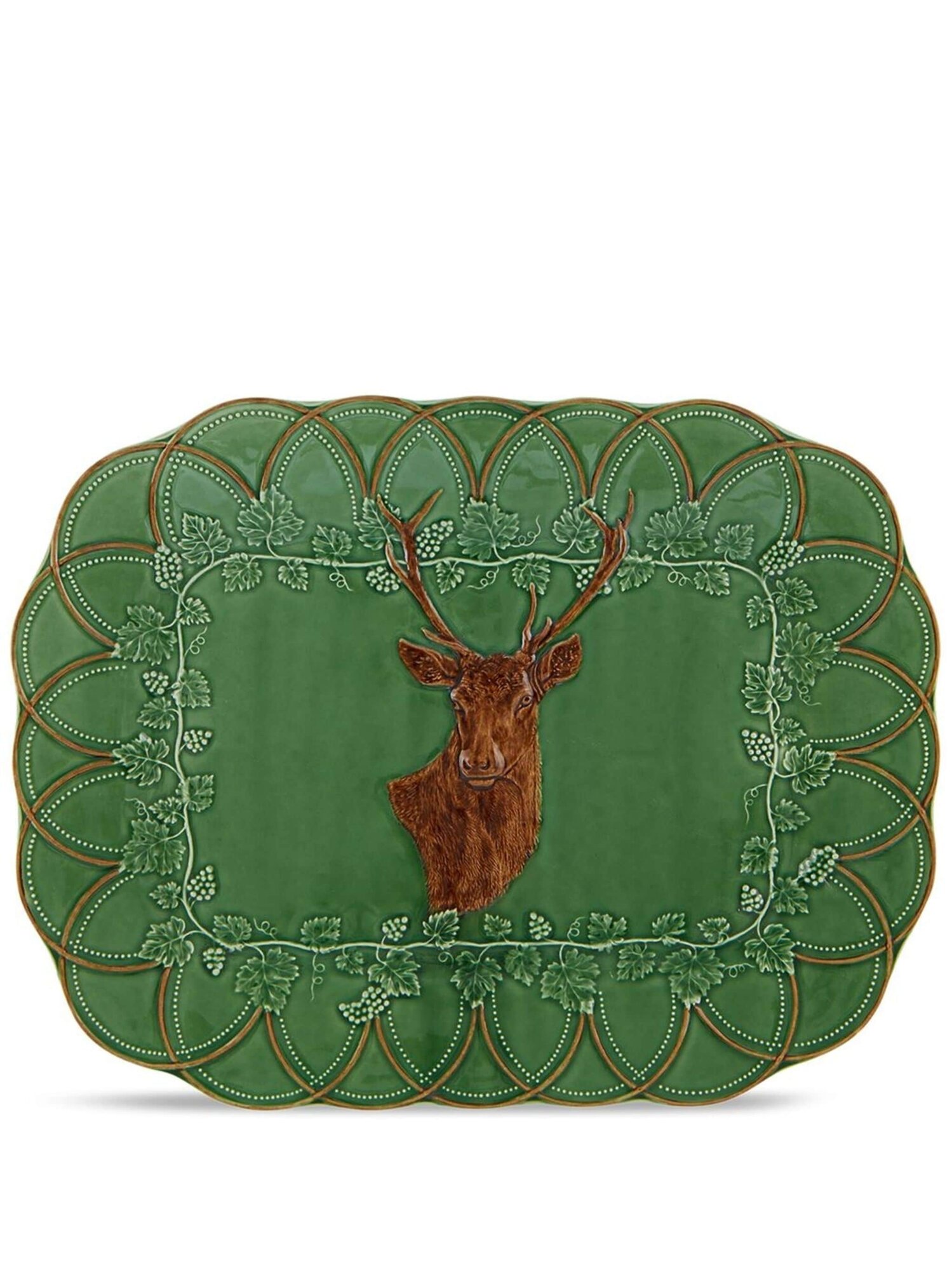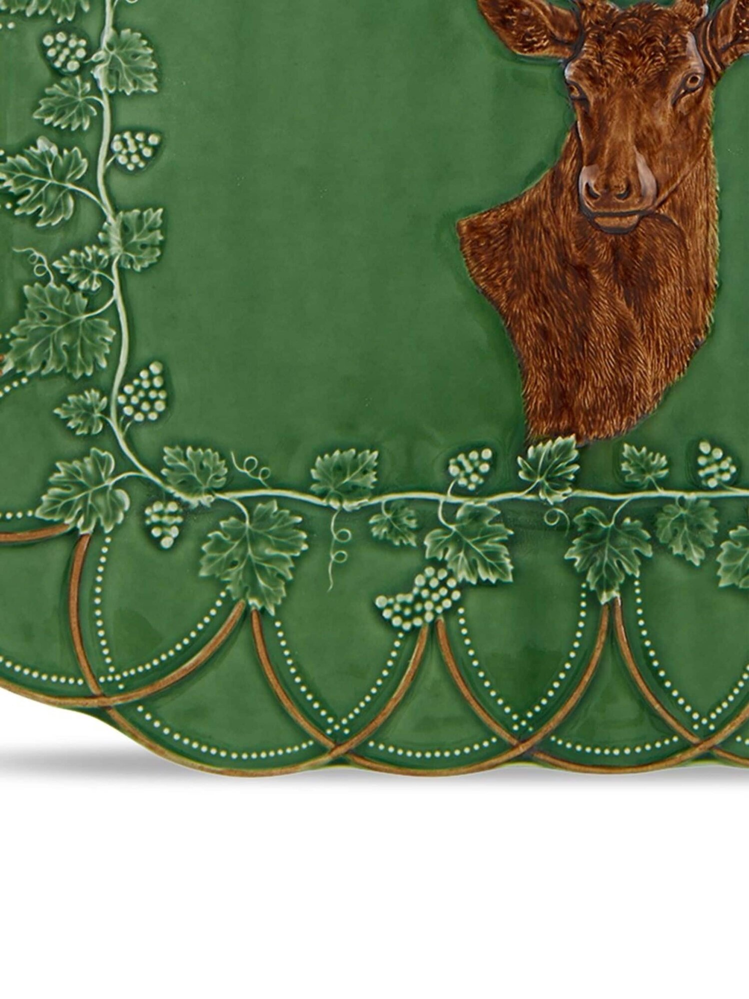 Цвет зеленой спаржи, коричневый, глазурованное покрытие, принт с изображением оленя, края с фестонами и цветочная деталь.