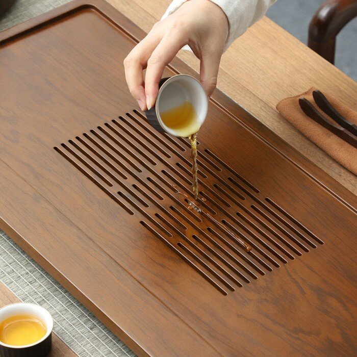 Поднос (чабань) - большая деревянная чайная доска для чайной церемонии. Этот изысканный предмет из натурального бамбука станет неотъемлемой частью вашего чайного ритуала. Прямоугольной формы и красивого дизайна, он подарит вам уют и комфорт во время чаепития. Поднос идеально подходит для сервировки чая. Вы можете удобно разместить на нем свои чайные принадлежности, а также поставить чашки и чайник. Доска имеет специальный поддон для слива воды, который предотвратит разлив чая на вашем столе.