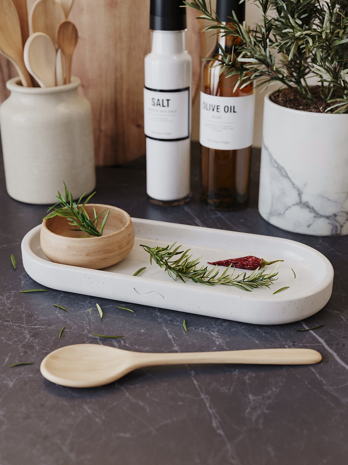 Подставка для кухонных аксессуаров из коллекции Astrid от MUSKO HOME - это универсальный кухонный поднос, изготовленный вручную из особо прочного бетона. Изделие обработано водоотталкивающим лаком, надёжно защищающим текстуру от воды и грязи.