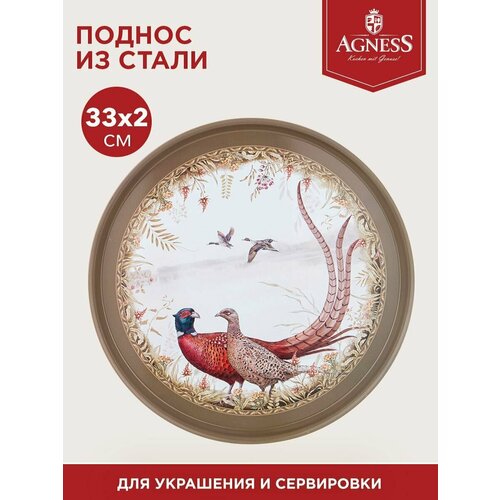 Поднос сервировочный коллекция охота 33х2,1 см Agness (176572) Поднос - это необходимый предмет для организации сервировки стола. Поднос имеет оптимальную круглую форму диаметром 33 см и удобные для переноса содержимого приподнятые стенки высотой 2,1 см. Коллекционный дизайн создает уютную атмосферу в интерьере. Благодаря глянцевой поверхности, поднос неприхотлив в уходе – достаточно протереть влажной тряпкой. ТМ AGNESS – отличный выбор!